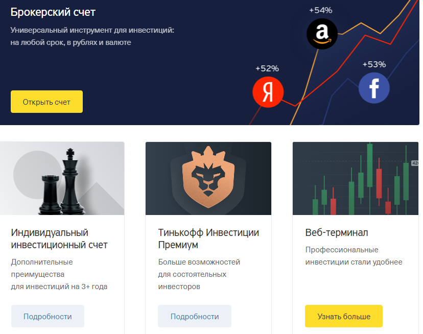 Тинькофф-Банк предлагает клиентам своё активное посредничество в разных видах инвестирования
