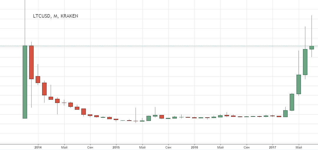 Непосредственно инвесторам будет полезно узнать, что совсем недавно LTC вышел из более чем трехлетней ямы. Впрочем, на сегодняшний день ажиотаж успел несколько утихнуть (что видно ниже на месячном графике) и дальнейшая судьба долгосрочной динамики актива остается предметом бурных дискуссий.