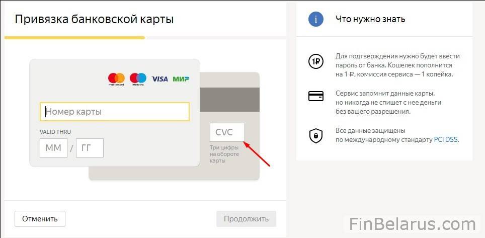 6. Система сразу же предложит привязать банковскую карту. Это позволит вам оплачивать счета при пустом электронном кошельке. Для проведения оплаты достаточно лишь ввести разовый код из SMS и трехзначный код CVC2/CVVC2 – он указывается на обратной стороне карты.
