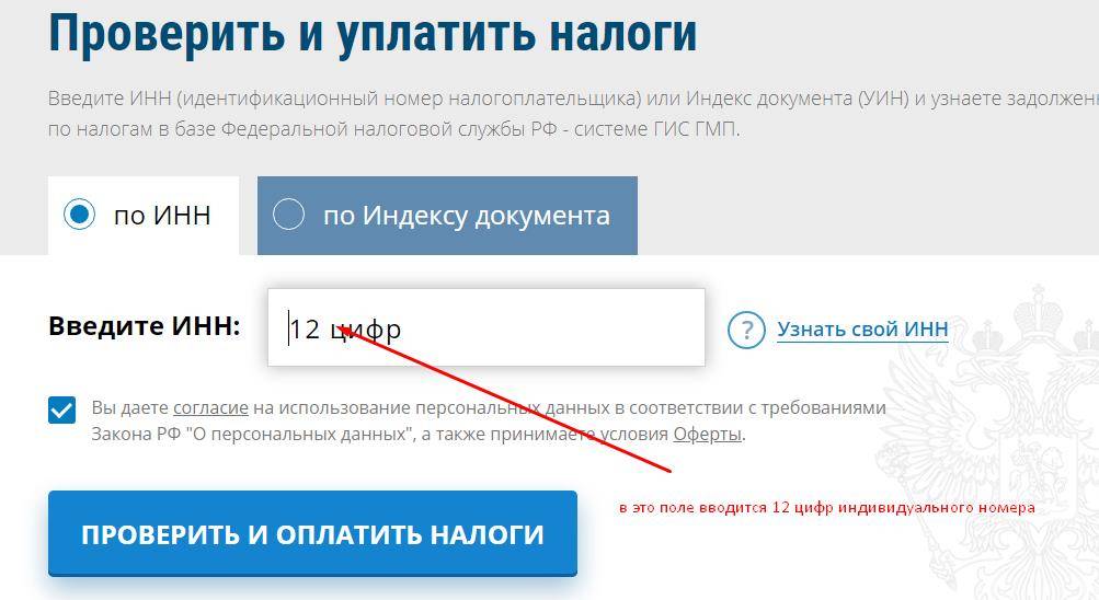 В прямоугольное поле нужно ввести либо 12 цифр ИНН, либо 20 цифр индекса документа. После этого нужно нажать на прямоугольник «проверить и оплатить налоги».