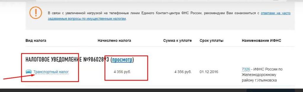 Узнать, за какой период начислен транспортный налог, можно в первой колонке таблицы – “Налоговый период”.