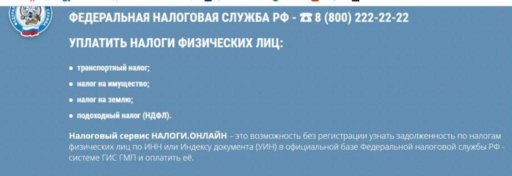 Сервис Налоги.онлайн позволяет физическим лица, плательщикам налогов прилучить нужную информацию без открытия личного кабинета и специальной регистрации. Идентификация плательщика осуществляется по ИНН.