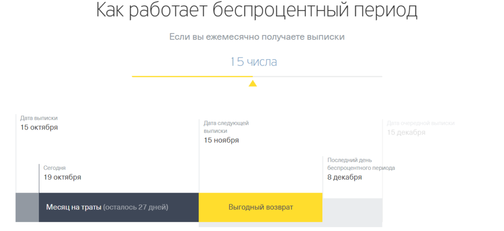 Ежемесячно клиенту направляется выписка, в которой указывается сумма задолженности на конец отчетного периода и дата, до которой должен быть осуществлен платеж. На эту информацию надо ориентироваться при пользовании грейс-периодом. На сайте есть специальный сервис позволяющий определить сроки беспроцентного периода. В нем достаточно указать дату ежемесячного получения выписки. Автоматически компьютер подскажет информацию об оставшемся отчетном периоде, сроке для внесения обязательного платежа и общей продолжительности беспроцентного периода.