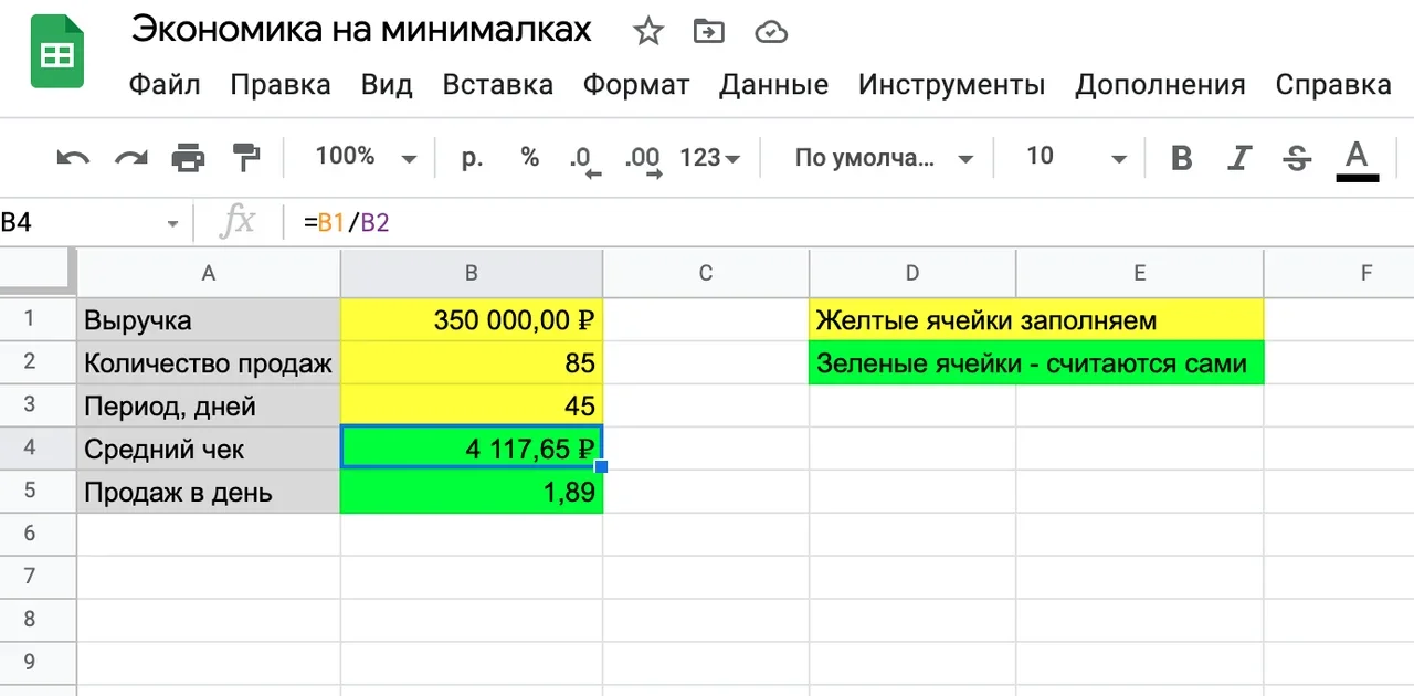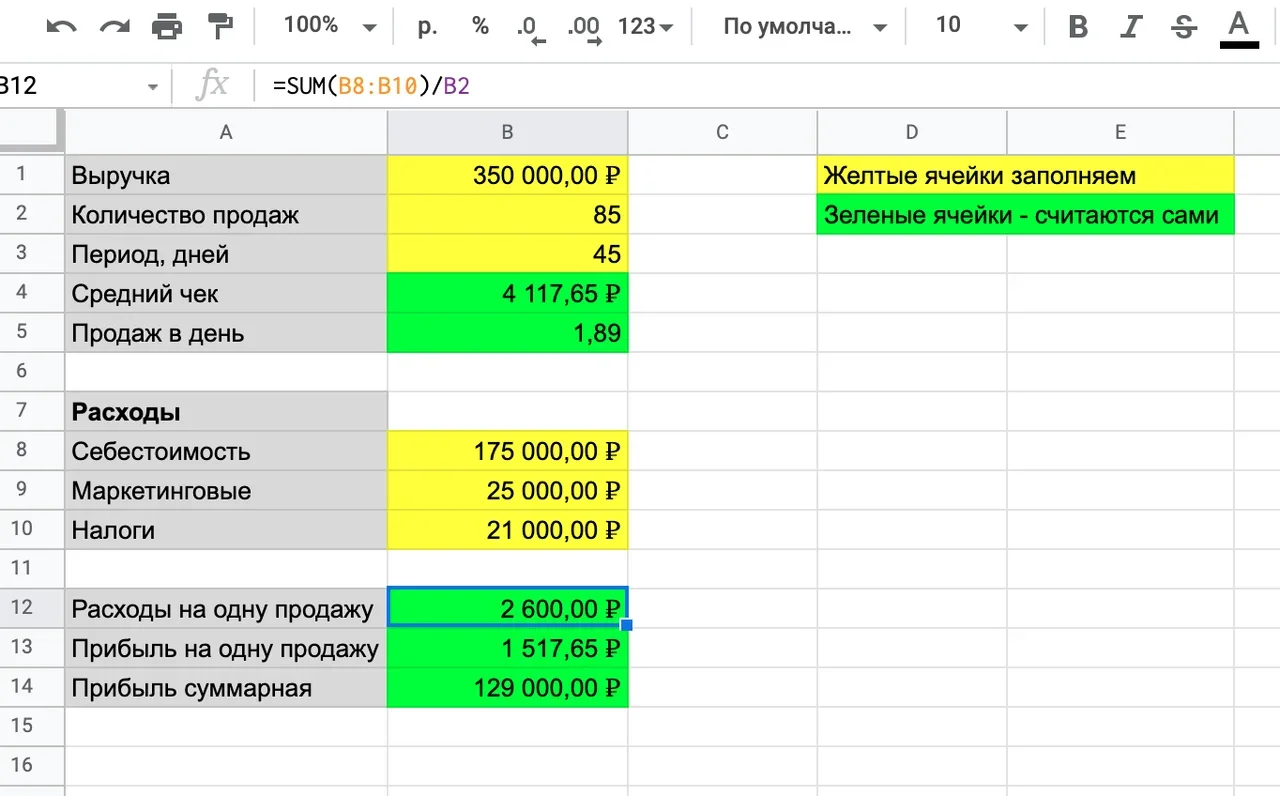 Нам надо рассчитать средний чек. Это проще сделать в электронных таблицах. Мы будем делать расчеты в . Для заполнения таблицы понадобится бизнес-показатели: выручки, расходов на производство, маркетинг, налоги и другие. Рекомендую заполнять ее вместе с руководителем маркетинга в компании или руководителем самой компании. Таблица работает очень просто — заполняете все желтые ячейки, а в зеленые считаются автоматически.