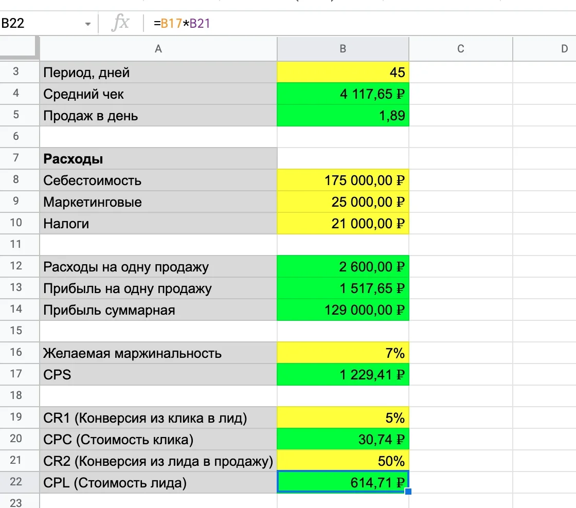 CPS умножаем на конверсию из лида в продажу (конверсию менеджера по продажам) и получаем CPL, далее умножаем CPL на конверсию из клика в лид и получаем цену клика (CPC). Для нашего проекта это максимально допустимые стоимости клика и лида, при которых будет достигаться нужная маржинальность.