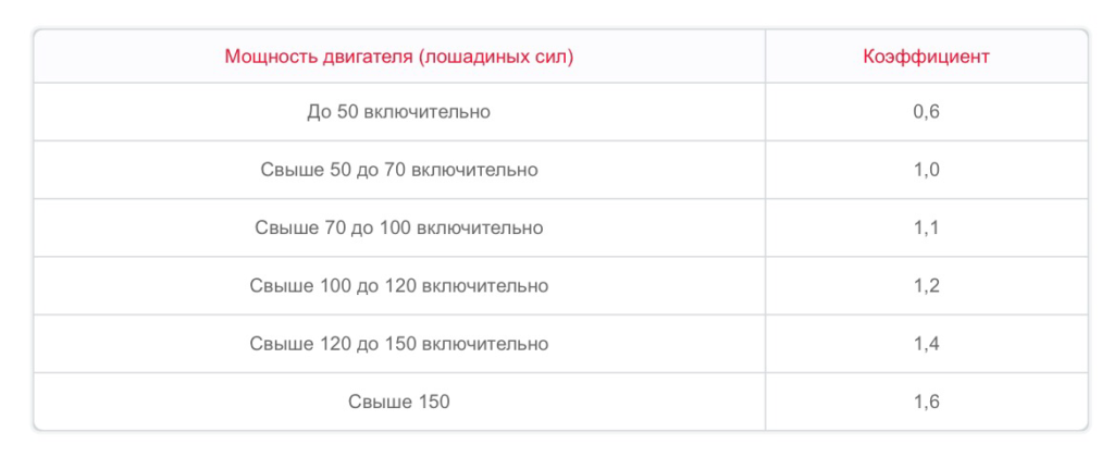 КМ колеблется в пределах от 0,6 до 1,6. Минимальный коэффициент 0,6 относится к «слабым» моторам, развивающим мощность не более 50 лошадиных сил. «Единица» применяется для автомобилей с двигателем, имеющим мощность 50-70 лошадиных сил, 1,1 используется в отношении моторов 70-100 лошадиных сил, 1,2 – 100-120 «лошадей», 1,4 – если автомобиль имеет мощность 120-150 лошадиных сил. Для транспортных средств мощностью свыше 150 «лошадей», КМ составляет 1,6.