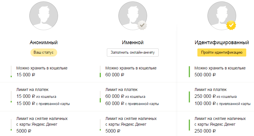Владельцы именных кошельков могут за раз отправить максимум 15 000 руб. Держатели идентифицированных аккаунтов — не более 75 000 руб. за одну транзакцию. Суточный лимит для всех видов аккаунтов — 150 000 руб. Месячный лимит для всех — 600 000 руб. Отправка денег на заграничные VISA и MasterCard разрешается 5 раз за 24 часа.