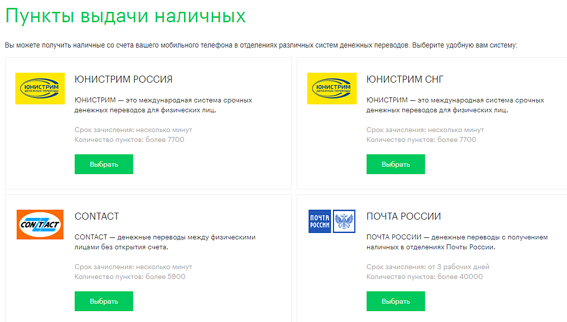 Снять деньги с телефона наличными сразу можно в отделении Почта России или офисах систем денежных переводов Unistream, Контакт.