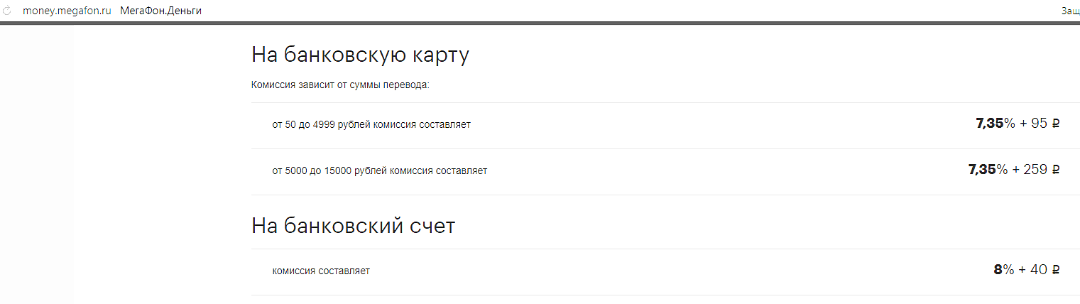 За вывод на карту забирают от 50 до 400 рублей. Сетка комиссий напоминает Билайн.