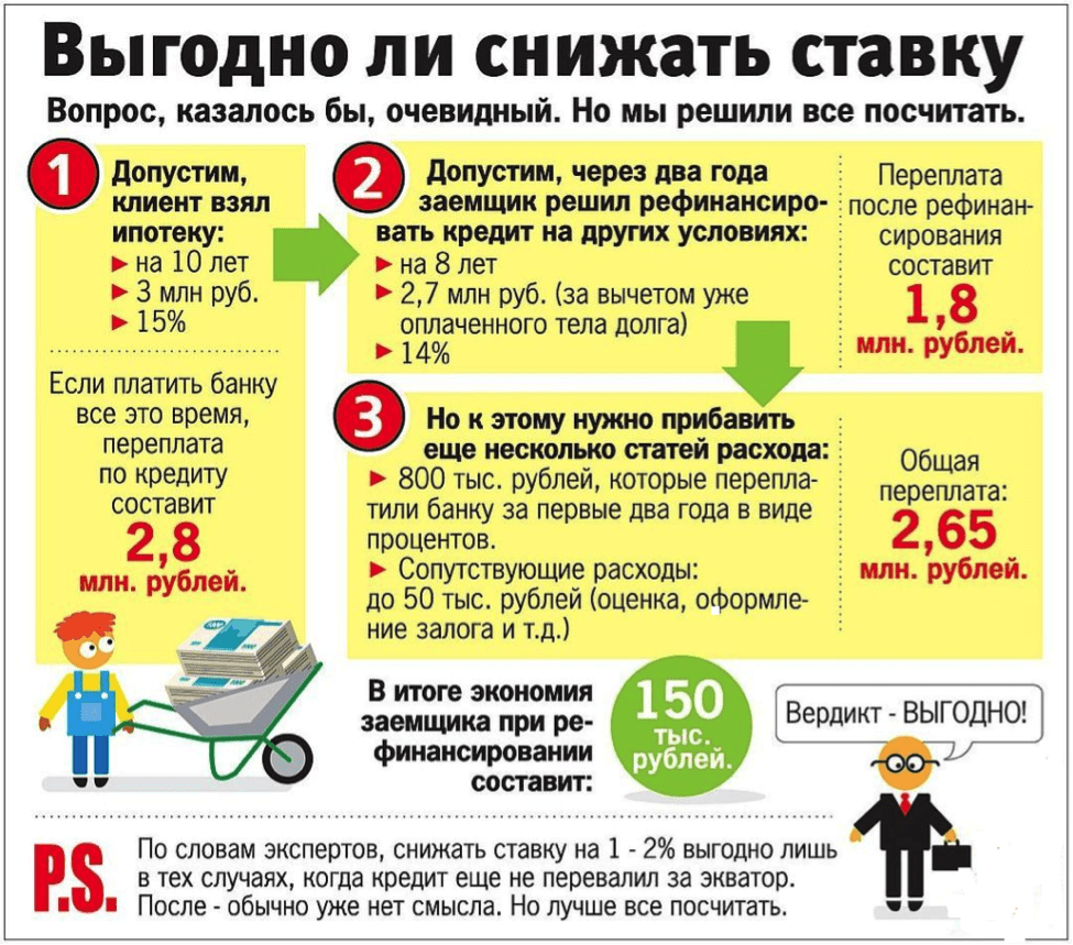 Есть смысл рефинансировать ипотеку, если размер процентной ставки ниже как минимум на 2%. Следует понимать, что это сложная процедура. Первым делом следует выбрать банк, который предлагает рефинансирование ипотеки. После посчитать сумму, которую получится сэкономить, с учетом новой ставки. В расчете следует учесть дополнительные расходы, к примеру, плату за оформление новой страховки.