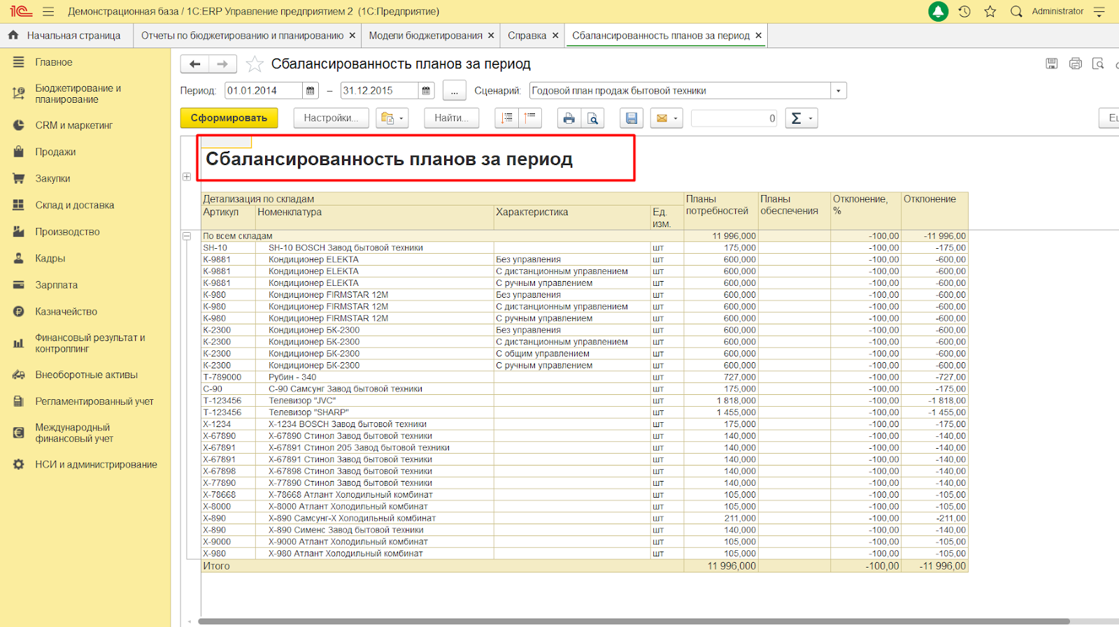 Кроме того, имеется несколько типовых отчетов, на основании которых можно получить информацию для прогнозирования прибыли. При их анализе создается прогноз на требуемый период. К таким отчетам относится «Исполнение планов продаж и закупок». Сверить сочетание планов между собой можно через отчет «Сбалансированной планов».