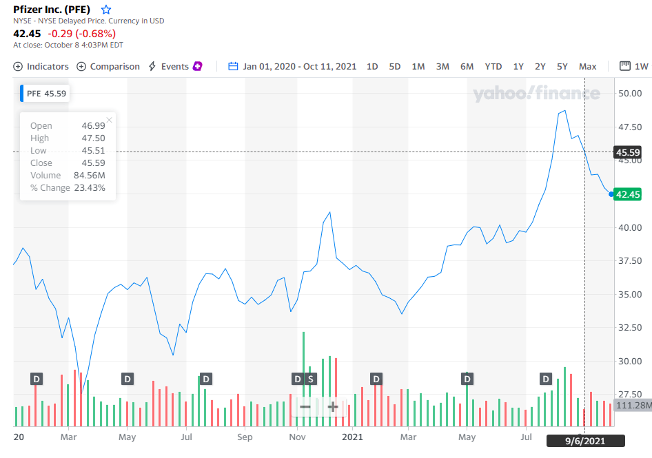 - Pfizer Inc. Пандемия Covid-19 подогревает интерес к корпорации, как к одному из возможных создателей вакцины и со стороны долгосрочных инвесторов, и со стороны day-трейдеров. Выручка и прибыль компании стремительно увеличились, что отразилось на стоимости акций.