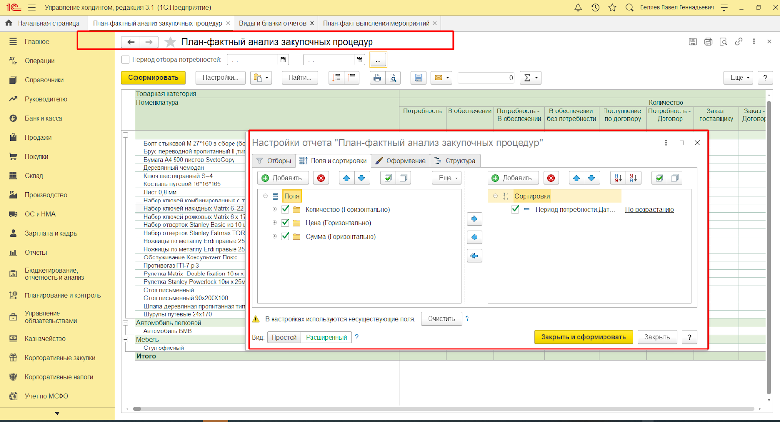 План-фактный контроль в 1С:Управление холдингом проводится в любой момент времени и на любых этапах деятельности компаний, к примеру, на этапе закупок. Процесс проводится на основании информации, внесенной в 1С или полученной через интеграцию из других источников. План-фактный отчет по закупочным процедурам позволяет проанализировать количество, цену, сумму сделки и т.п.