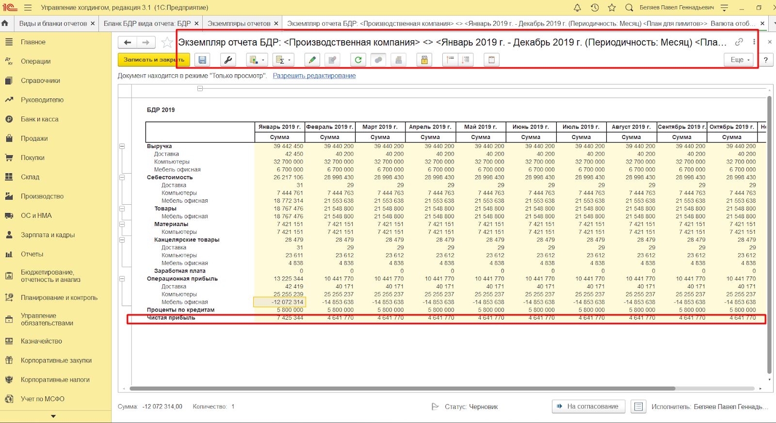 На основании показателей из этих справочников выводится прогнозная прибыль по компаниям, которые входят в холдинг. Периодичность составления прогноза зависит от периодов, которые настроены в сценариях планирования.