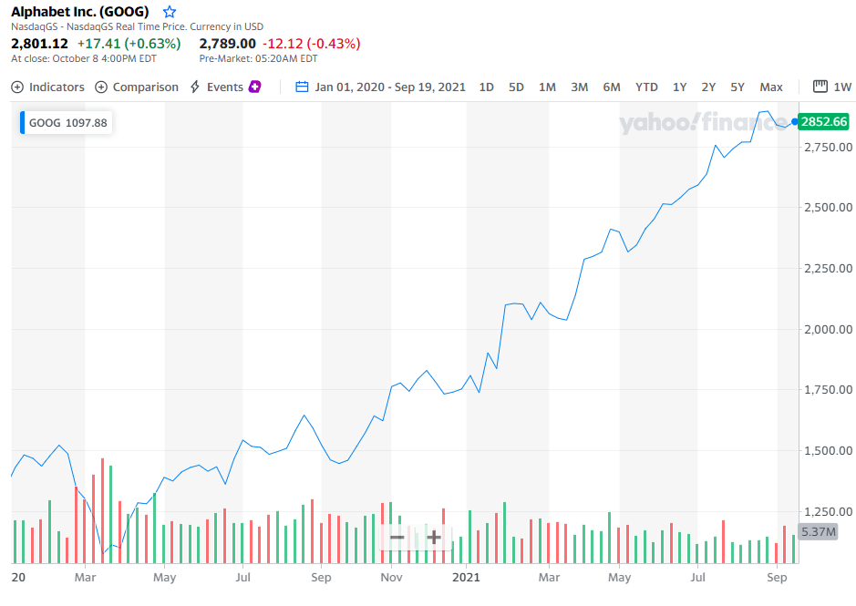 - Alphabet. Пандемия породила значительное увеличение поискового трафика, так как люди стали больше времени проводить в сети. В результате доходы Google и YouTube выросли, что подтолкнуло акции их владельца – холдинговой компании Alphabet к росту. Менее чем за два года бумаги компании выросли вдвое.