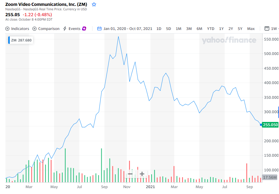 - Zoom Video Communications. В период пандемии предложенный компанией сервис видеоконференций стал особенно популярным. Стоимость акций с начала пандемии до ноября 2020 года увеличилась более чем в 7 раз: с $73 до $559 за штуку. Затем последовала плавная коррекция, когда в течение года бумаги компании подешевели больше чем вдвое – до $255 за штуку. При этом по сравнению с началом 2020 года акции все равно стоят в 3,3 раза дороже, а отчетность Zoom показывает, что бизнес развивается быстрыми темпами.