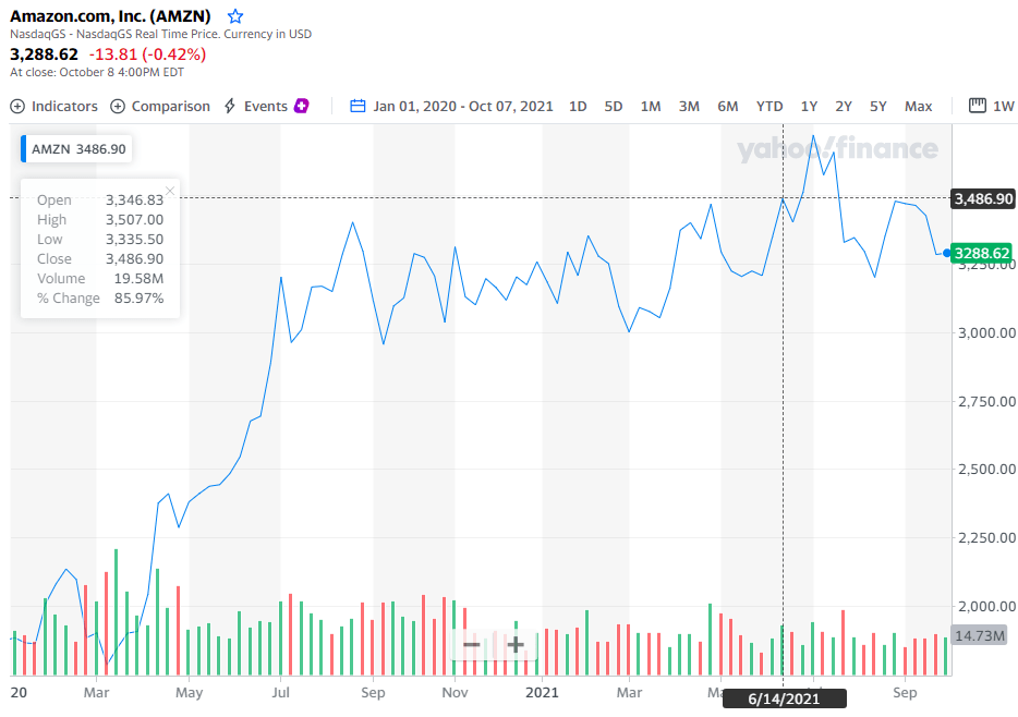 - Amazon.com. Компания активно растёт не первый год в динамично развивающейся нише электронной коммерции, что в сочетании с устойчивым ростом цены акций и отсутствием дивидендов делают ее типичной компанией роста. Стоимость бумаг на начало 2020 года составляла $1.883 года, а к октябрю 2021 года достигла $3.288. Таким образом, менее чем за 2 года акции выросли примерно на 74%. Выручка и EBITDA Amazon уверенно растут много лет подряд.