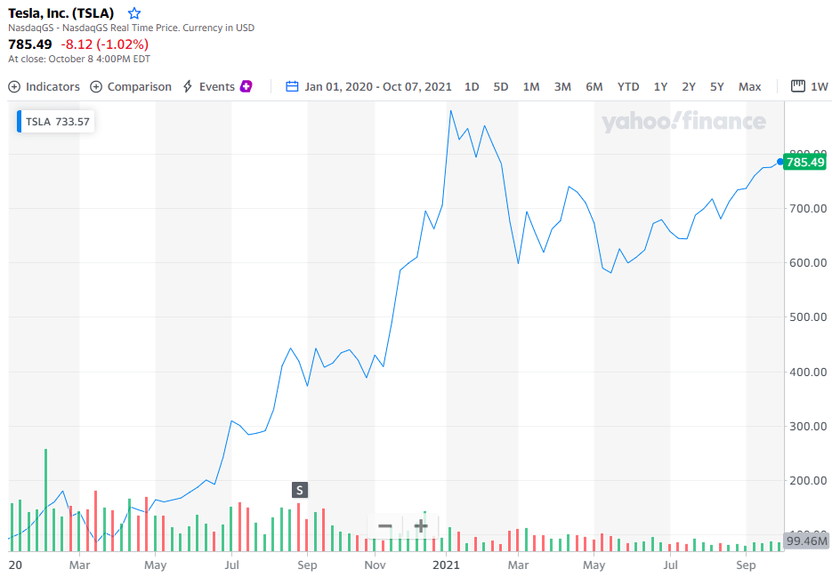 - Tesla Inc. С середины 2020 года эти бумаги продемонстрировали беспрецедентный рост, что на фоне общего роста спроса на электромобили делает ценные бумаги компании акциями роста. За период пандемии бумаги выросли с $95.73 до более чем $775 по состоянию на октябрь 2021 года. Компания показывает устойчивый рост продаж и прибыльность.