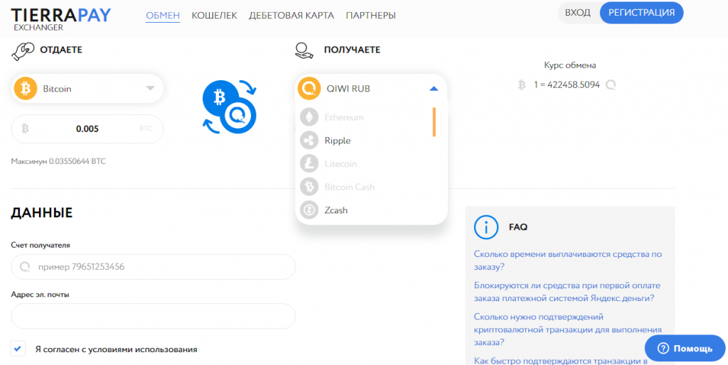 Процесс аналогичен пополнения, только в качестве обменной валюты выступает сам BTC, а валюта назначения выбирается из списка.