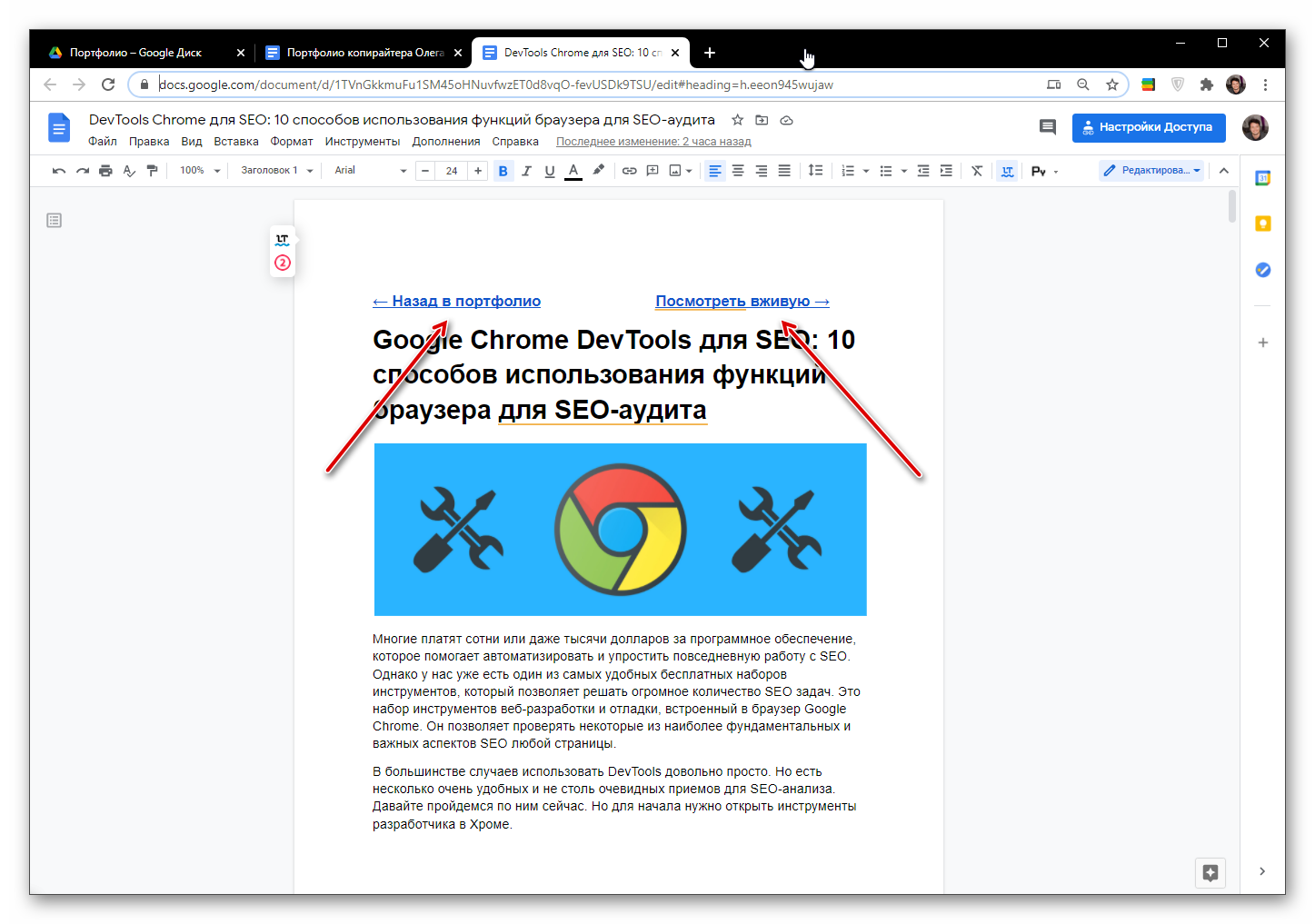 Первая ведет назад на основную страницу портфолио. Вторая — на опубликованную статью в интернете. Если нет возможности показать опубликованный вариант, то просто не ставьте ссылку.