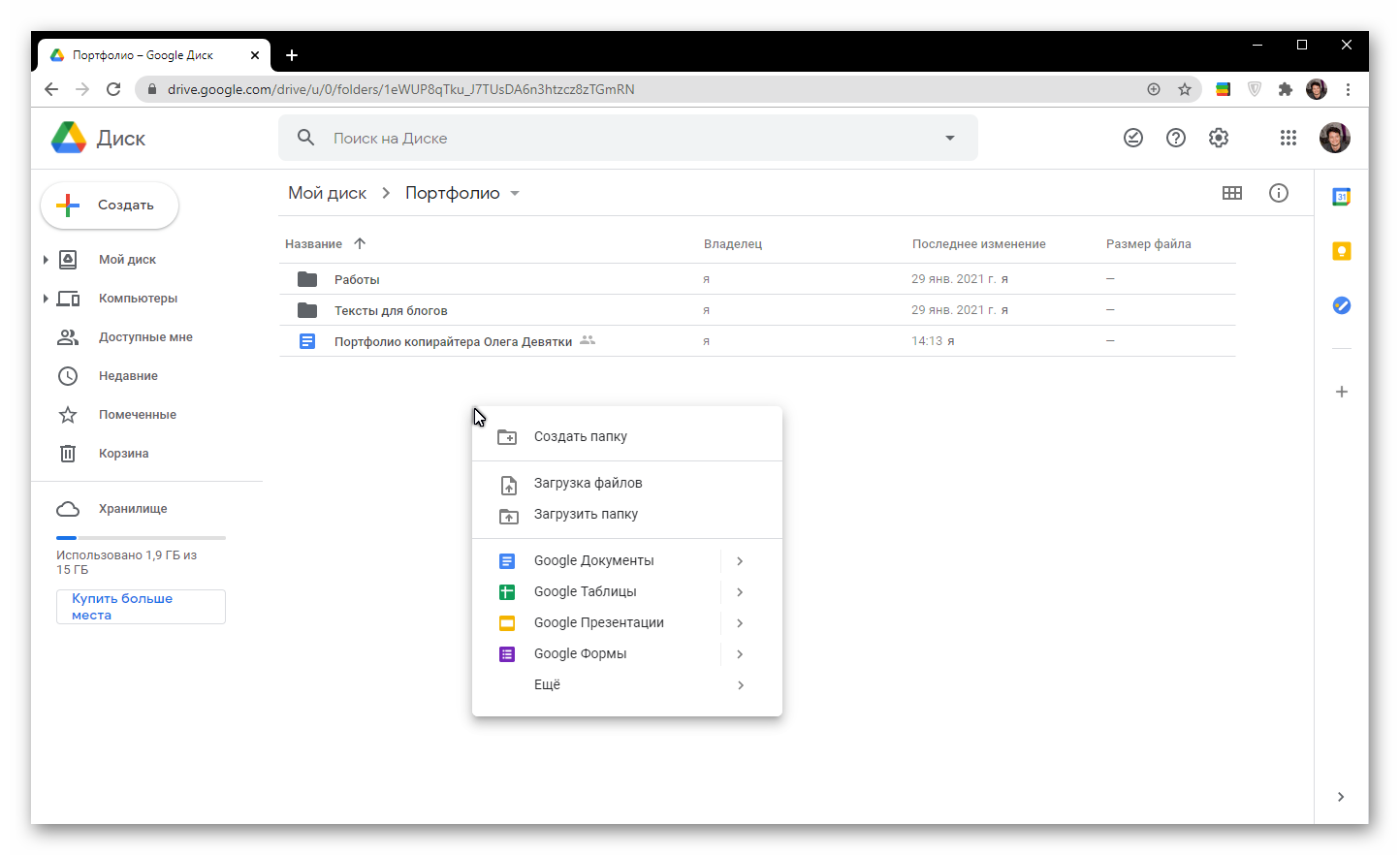 Представьте, что вы работаете не в браузере, а прямо у себя на рабочем столе компьютера. Правой кнопкой мыши вызывается контекстное меню, в котором можно создать папку или файл.