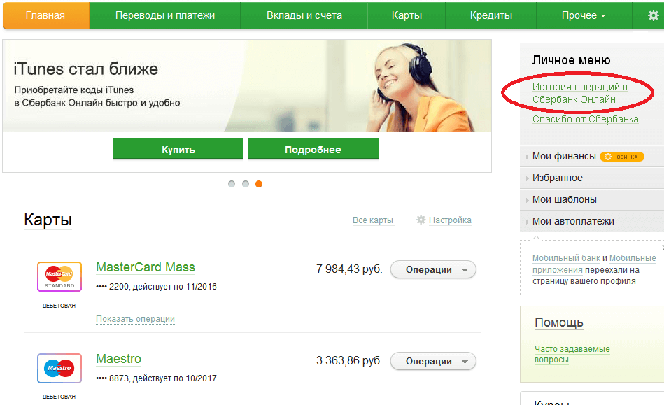 - Войти в личное меню в «Историю операций Сбербанк Онлайн».