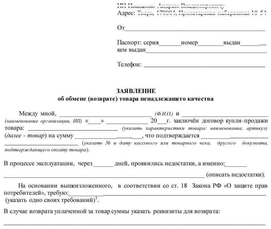 - После проверки документов и возвращаемого товара клиент составляет заявление. Оно оформляется в письменном виде и содержит следующую информацию: