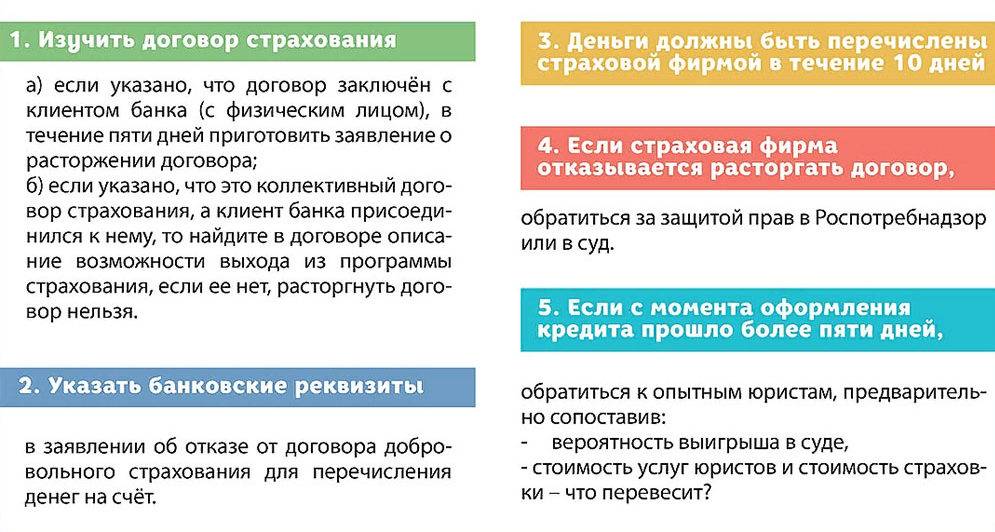 Вариант добровольного страхования рекомендуется отклонять еще при заключении соглашения с банком, т.е. убирать такой пункт из документа. Если же кредитная организация отказывает по каким-либо причинам в займе, а денежные средства нужны срочно, нужно внимательно изучить условия кредитования, в т.ч. правила возврата страховых выплат после заключения сделки.