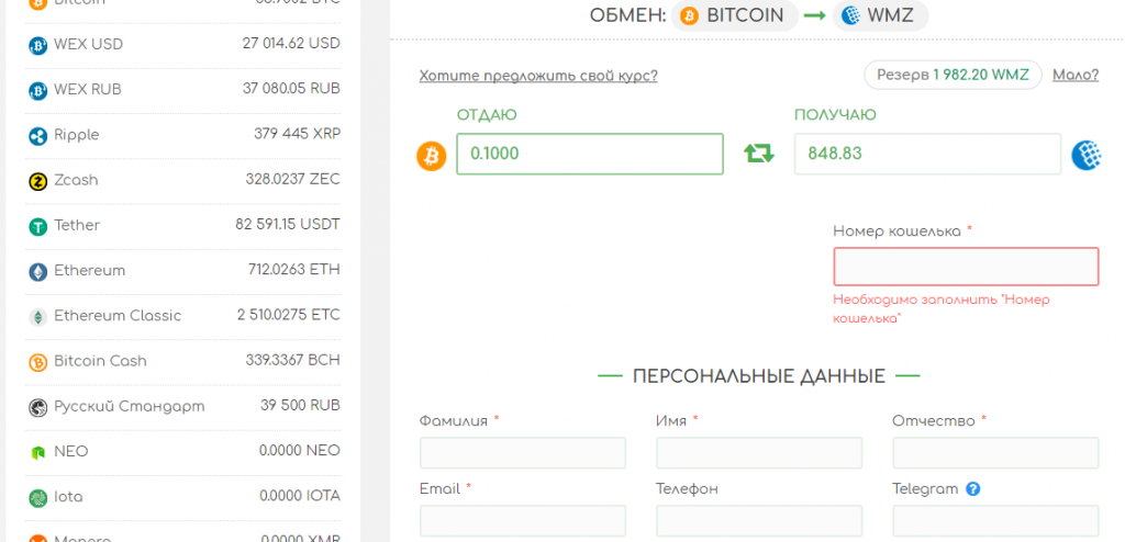 Вы перейдете непосредственно в обменник, где необходимо заполнить все данные: