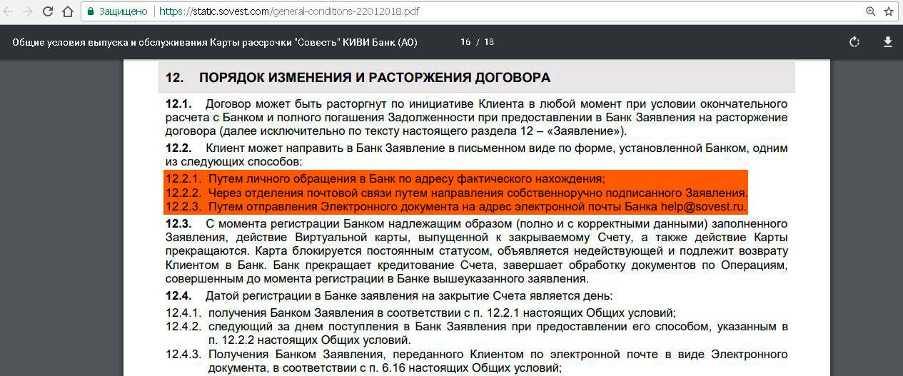 КИВИ Банк при закрытии счета просит указать причину такого решения. Как причину закрытия карты рассрочки «Совесть» вы можете указать, например, малый размер кредитной линии, или что не устроило качество обслуживания, изменилось ваше финансовое положение, не подходят высокие тарифы по обслуживанию, неверно предоставлена информация при оформлении или что вы собираетесь использовать продукт другого банка.