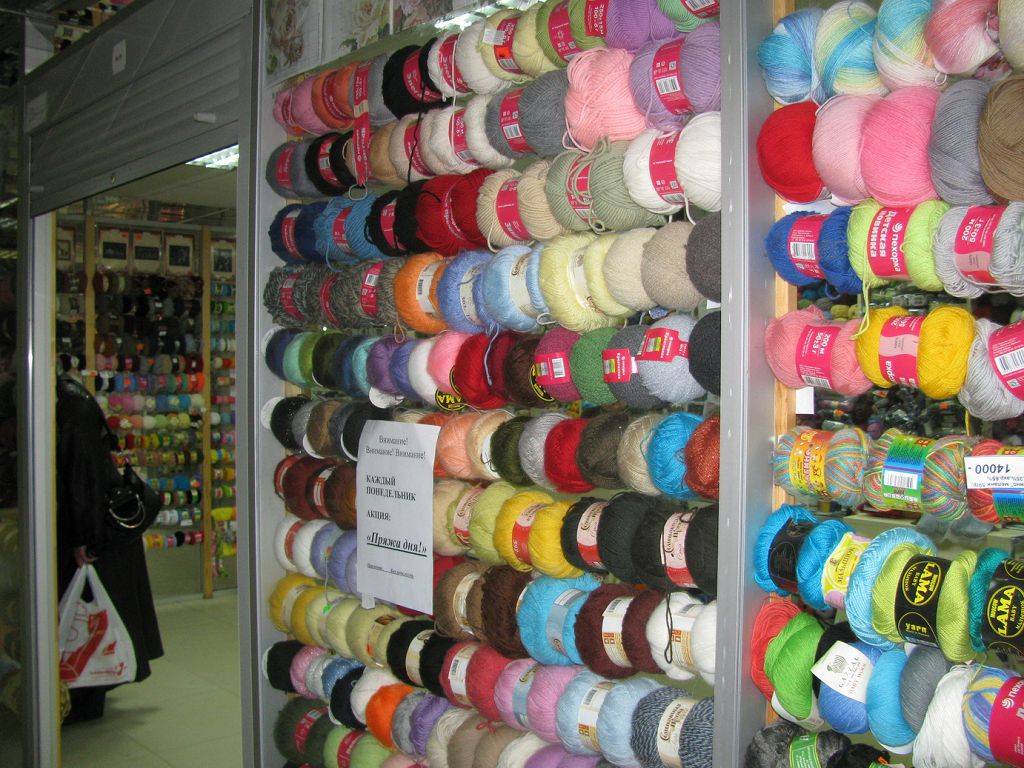 Разнообразие пряжи в магазине.