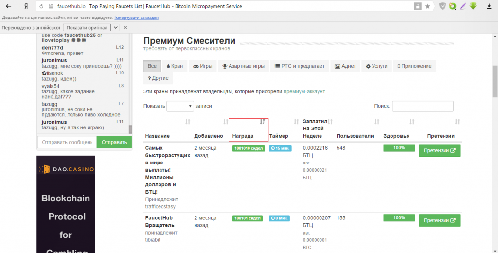 Выбираем любую валюту, важно настроить отображение по награде, которую дают краны, от большего к меньшему, для этого дважды щёлкаем по значку «награда». Для того чтобы совершить переход на страницу крана, необходимо нажать «Претензии», кран откроется в новом окне