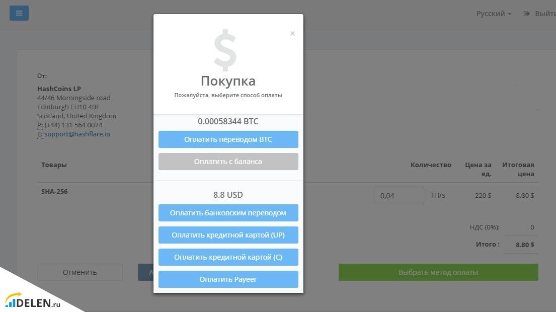 После выбора хэшрейта и мощности, переходите к выбору методов оплаты. Процесс платежа стандартный – ввод реквизитов своего счета.