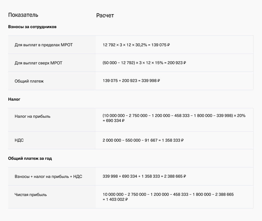 Для индивидуальных предпринимателей расчеты аналогичные, только нужно учесть еще страховые взносы ИП за себя — об этом рассказываем в отдельной статье.