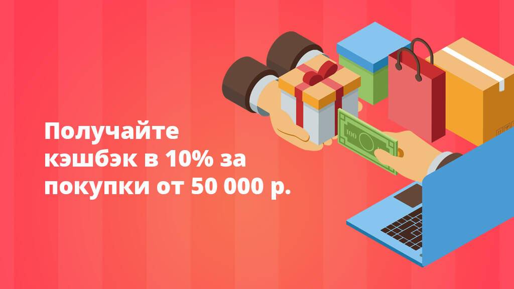 - За покупки от 50000 рублей своими деньгами – кэшбэк 10%;