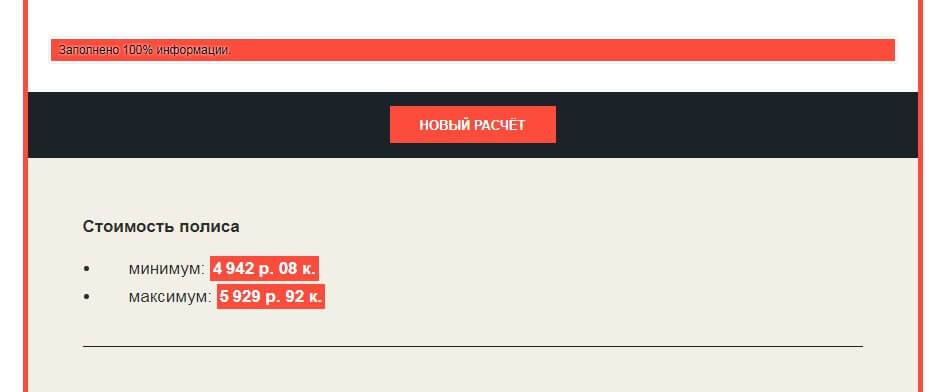 После заполнения всех имеющихся в онлайн-калькуляторе пунктов, нажимается кнопка «Рассчитать стоимость», после чего программа выдаёт цену полиса ОСАГО, вычисленную на основании представленной пользователем информации.