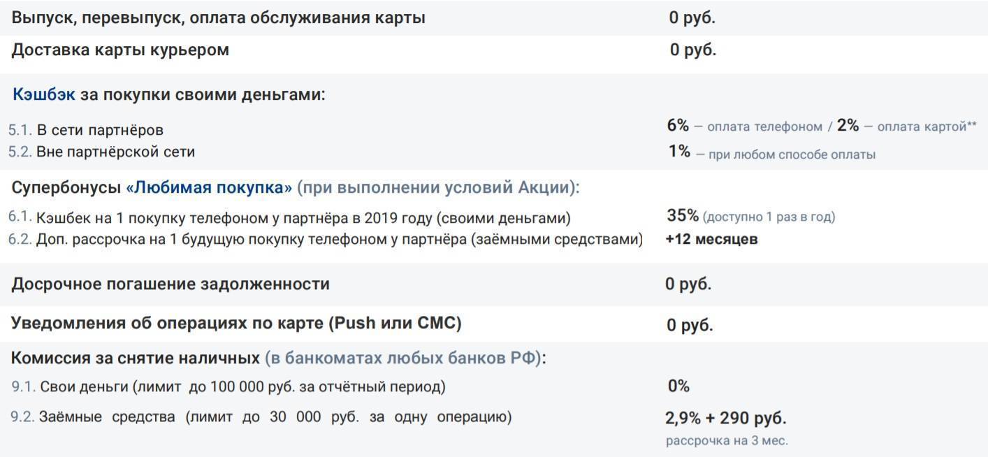 | Кэшбэк | 6% — при оплате смартфоном в магазине-партнере 2% — при оплате картой у партнера или смартфоном в другом магазине 1% — при оплате картой в другом магазине 35% — по акции “Любимая покупка” | |