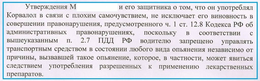 Разумеется, от приёма тех же пресловутых 20-ти капель «Корвалола» человек не пьянеет, подозрений у инспектора ДПС – вызывать не начинает. Но если в течение недели (а то и дольше!) после приёма он по каким-то причинам оказывается на медицинском освидетельствовании, то можно быть почти уверенными, что в итоге будет вынесен акт по учётной форме № 307/у-05 с заключением «Установлено состояние опьянения». А дальше – протокол об административном правонарушении по ч. 1 ст. 12.8 КоАП РФ, и дело направляется в суд. В общем, произойдет то же самое, что произошло с героем данной истории.