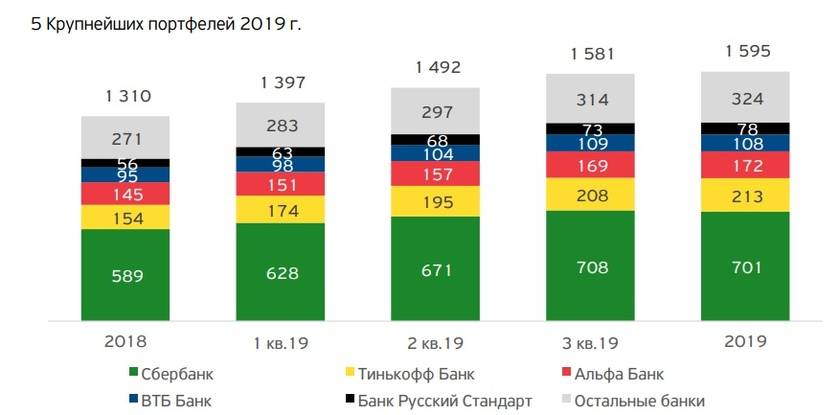 Тройка лидеров по итогам 2019 года осталась неизменной – Сбербанк (с портфелем в 701 млрд рублей), Тинькофф (213 млрд рублей) и Альфа-банк (172 млрд рублей).