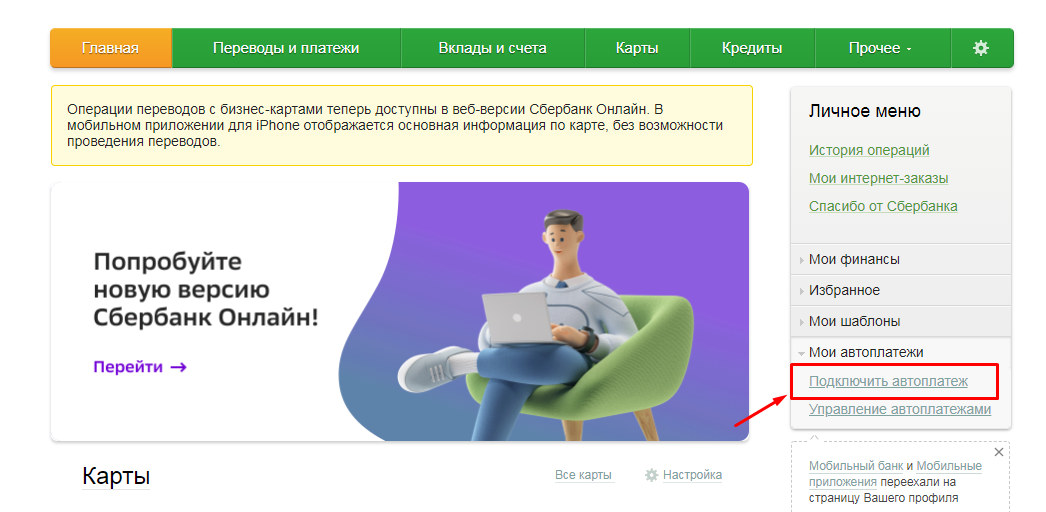 - Выбираем раздел «Подключить автоплатеж» в интернет-банке, мобильном приложении или на банкомате.