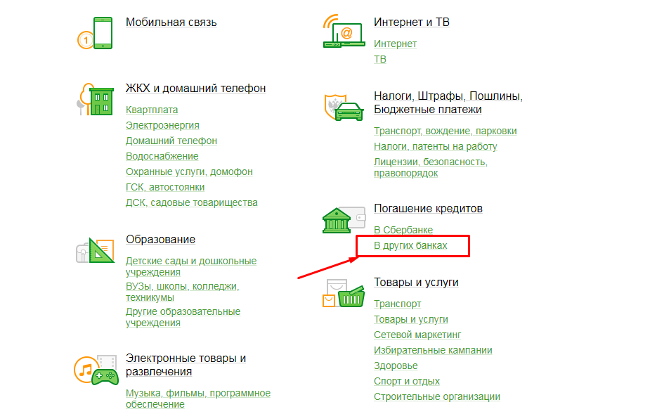 Как оплатить кредит через Сбербанк онлайн другому банку? Из личного кабинета, по кнопке «Погашение кредита в другом банке» (находится в разделе «Платежи и переводы»).