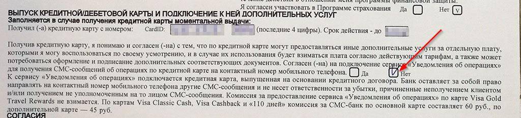 Бумаг немного. Первый лист называется «Анкета на выпуск кредитной карты». Там я сразу нашел пункт про страховку по карте. Как ни странно, в договоре уже стояла галочка, что страховка отключена (!). От СМС я тоже отказался:
