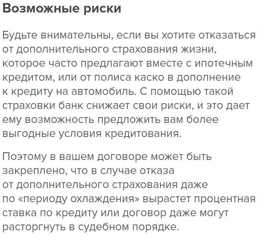 Стоит учитывать, что законодательством оставляет за банками право отказывать в кредитовании без объяснения причин. Таким образом, отказаться от страховки до оформления кредитного договора проблематично, и есть шанс остаться без нужного займа.
