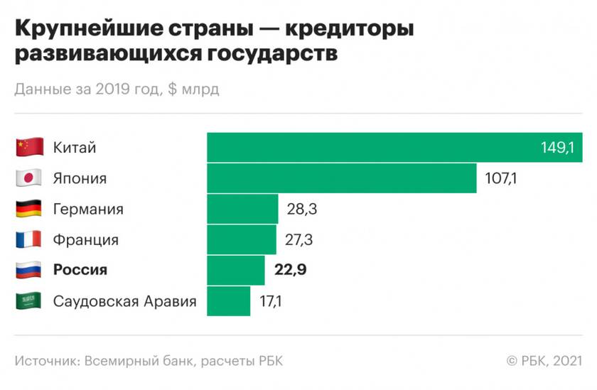 В целом Россия занимает пятое место среди крупнейших стран — кредиторов развивающихся стран. Лидером здесь является Китай, предоставивший средства в размере $149 млрд. За ним следуют Япония, Германия и Франция.