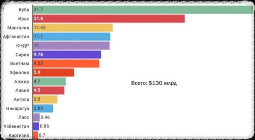 Куба ($31,7 млрд.). В 2014 года российское правительство списало 90% из суммы долга в 35,2 млрд. долларов.