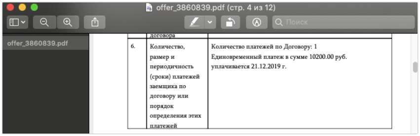 Предложила нам беспроцентный заём на 10 000 рублей, но включила разовый платёж. Его сумма — 200 рублей. Эту информацию мы нашли в договоре:
