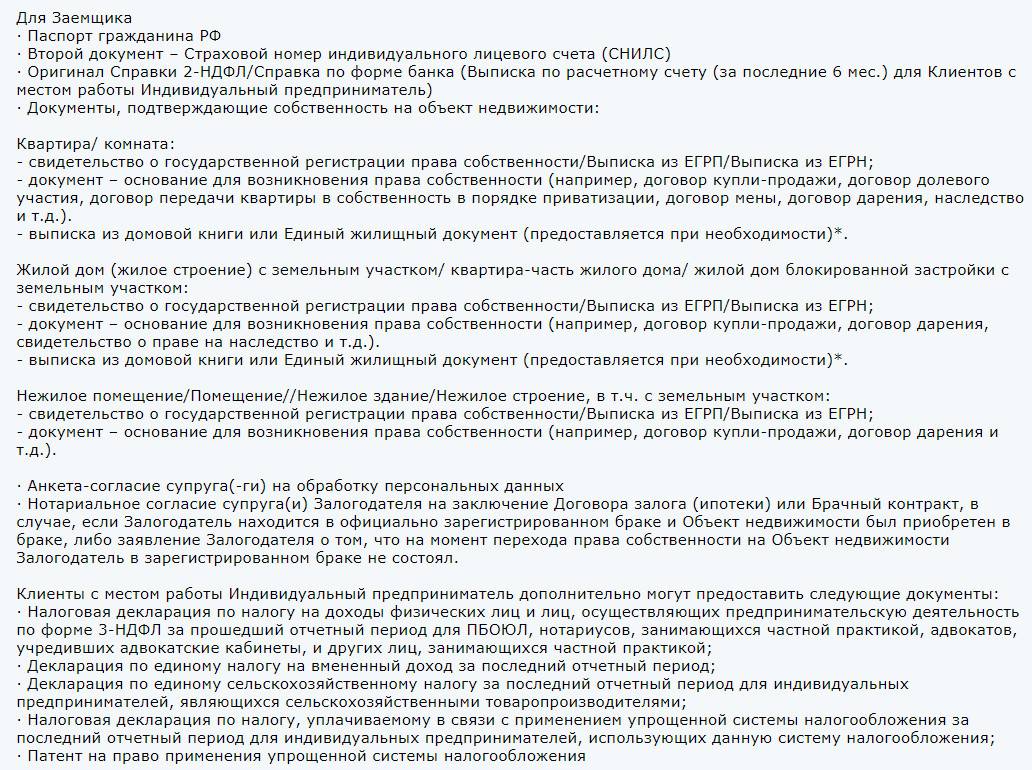 Для программы «Под залог недвижимости» нужно подготовить следующие официальные бумаги: