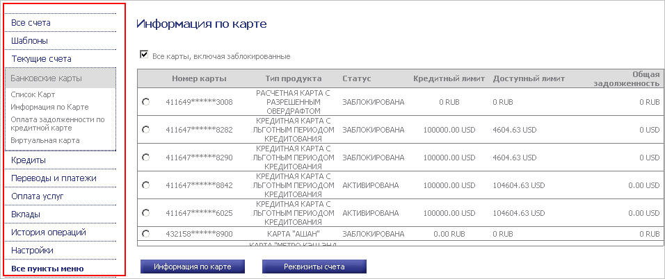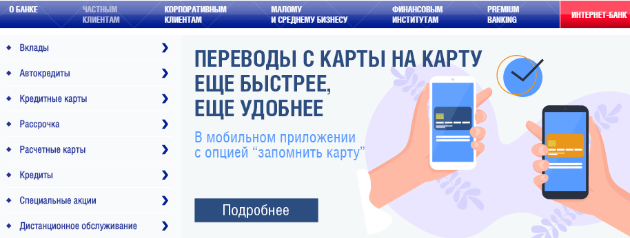 К основным операциям личного кабинета можно отнести просмотр данных по кредитам, выписка по картам и сведения о них, а также перевод средств и оплата услуг.