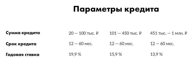 По этому предложению вы сможете получить от 20 тысяч до 1,1 миллиона рублей. Процентная ставка может составлять от 10,9% до 25,9% годовых, а договор заключается на удобный вам период от 1 до 5 лет.