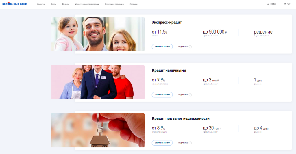Возможности получения дополнительного финансирования не ограничены кредитом наличными. Чтобы убедиться в правильности выбора кредитной программы, рекомендуется изучить все доступные варианты кредитования в разделе «Кредиты» на сайте «Восточного»: